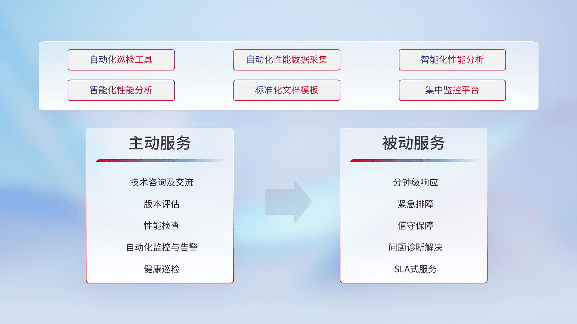 智能化工具和标准化文档,,,,保障服务质量,,,提供主动服务(包含技术咨询、、、、版本评估、、、性能检查、、自动化监控与告警、、健康巡检)和被动服务包含(分钟级响应、、、、紧急排障、、值守保障、、问题诊断解决、、、SLA服务)。。。